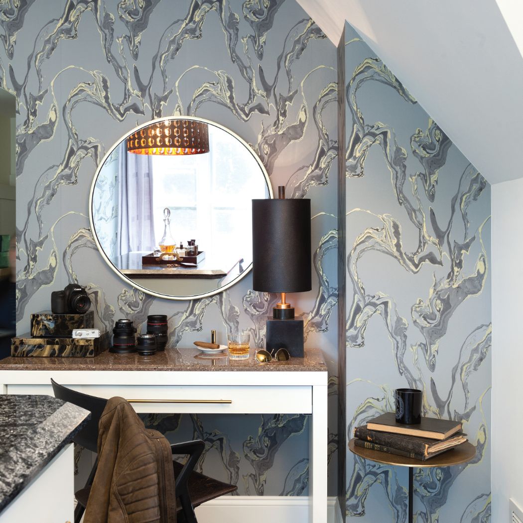 Like the sunlight that pierces the mysterious shadows of the wondrous Rosslyn Chapel, this design’s striking metallic golds shimmer against a nuanced background of warm taupe and tans.