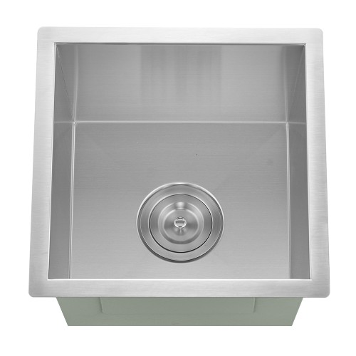 This single bowl undermount handmade sink is constructed with premium 16 and 18 gauge 304 Series stainless steel. 304 Series of “surgical grade” stainless steel is nonporous, hygienic, rust free and extremely durable. This contemporary sink is hand crafted and boasts zero radius corners, straight walls and extra deep bowls. The bottom has a undercoating applied and is fitted with sound deadening pads. These features help deaden sound attenuation and act to reduce condensation buildup on the bottom of the sink.